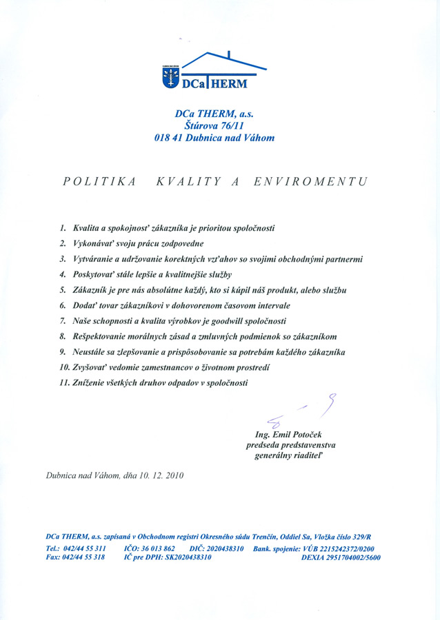 Spoločnosť DCaTHERM, a.s. bola založená v roku 1996. Hlavnou výrobnou náplňou spoločnosti je výroba, rozvod a predaj tepelnej energie z vlastných centrálnych a lokálnych zdrojov tepla na území mesta Dubnica nad Váhom a od roku 2010 tiež na území obce Lednické Rovne. V rámci tejto činnosti sú vyvíjané obchodné aktivity na dodávky priemyselných kotolní, opravy a údržbu kotlovej technológie, vykurovacích systémov a meracej a regulačnej techniky pre organizácie a fyzické osoby.